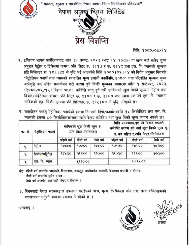 काठमाडौं । नेपाल आयल निगमले पेट्रोलियम पदार्थको मूल्य वृद्धि गरेको छ । निगममले राती १ बजेदेखि लागू हुने गरि पेट्रोलको मूल्य प्रतिलिटर ४ रुपैयाँ डिजेल÷मट्टितेलको प्रतिलिटर ३ रुपैयाँले मूल्य वृद्धि गरेको हो । यस्तै, खानामा पकाउने एलपि ग्यासमा साविकको खुद्रा बिक्री मूल्य प्रतिसिलिण्डर २३५ रुपैयाँले वृद्धि गरेको जनाएको छ ।